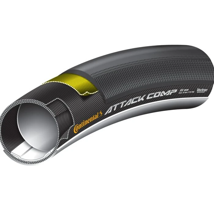 Le boyau Continental Attack Comp (avant) est spécialement conçu pour être utilisé avec le boyau Force Comp. L’Attack Comp plus étroit de 22 mm fonctionne bien et offre un meilleur aérodynamisme ainsi qu’une haute agilité pour des transitions plus rapides en virages.